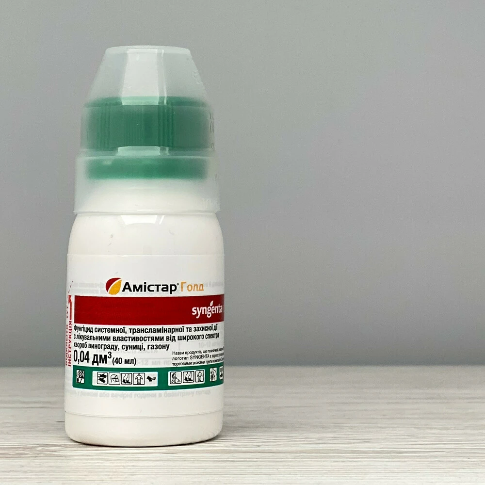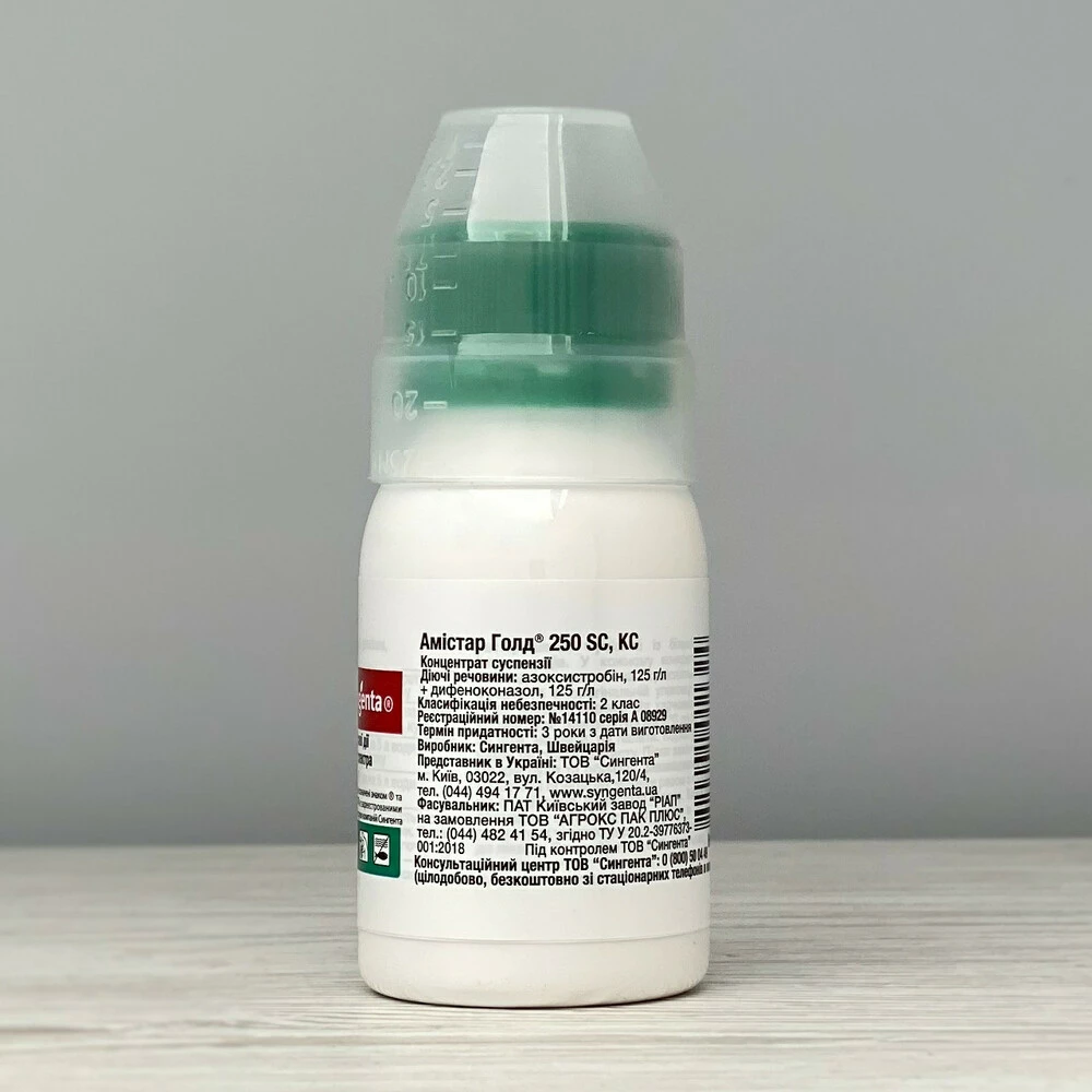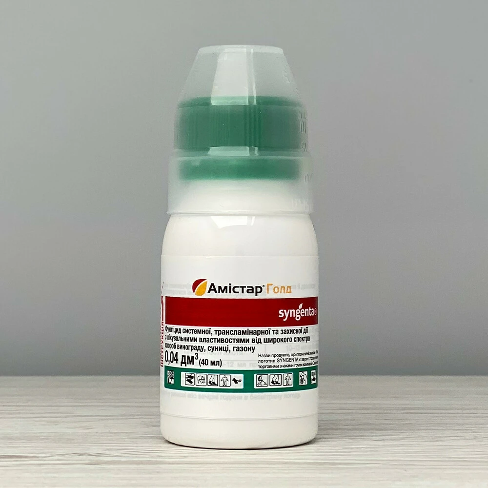 Амістар Голд 250 SC - двокомпонентний фунгіцид системної та трансламінарної дії призначений для обробки сільськогосподарських культур від широкого спектру грибкових захворювань. Найкраща ефективність дії фунгіциду проявляється при превентивних обробках на момент зараження. Виражена лікувальна дія препарату проти більшості збудників захворювань проявляється у знищенні патогену на ранніх стадіях захворювання та запобіганні подальшому розвитку хвороби на пізніх стадіях. При обприскуванні препарат швидко сорбується листям, інгібує зростання субкутикулярного міцелію і знижує рівень спороношення патогену. Крім лікувальної дії, препарат позитивно впливає на розвиток рослини (збільшує площу листової пластини, довжину пагона та його облистяність), забезпечує закладку врожаю наступного року.