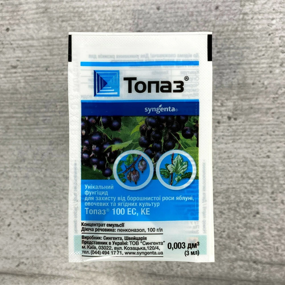 Завдяки системній дії препарату Топаз ® діюча речовина переміщується по рослині акропетально, трансламінарно і базипетально. За рахунок швидкого засвоєння рослиною (30 хв.) і системної дії Топаз ® має виражений стоп–ефект та лікувальні властивості, навіть якщо зараження відбулося за три дні до внесення препарату. Високоефективний проти чорної, аспергільозної та чорної плісневидної гнилей ягід винограду (за даними Національного інституту винограду і вина «Магарач»).