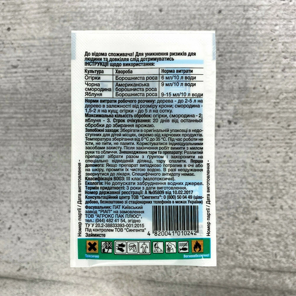 • Системна дія допомагає захистити всі частини рослини: швидке поглинання зменшує ризик змивання дощем