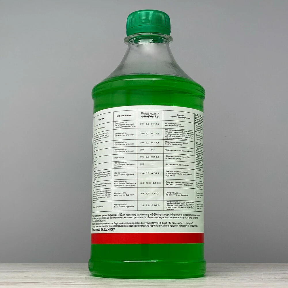 - Забезпечує повне знищення однорічних та багаторічних, злакових