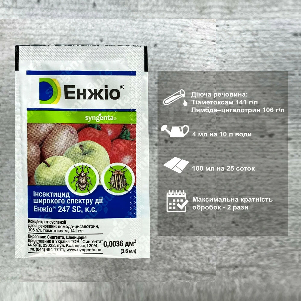 Не застосовувати в екстремальних погодних умовах, коли комахи перебувають у стресовому стані. Енжіо ® дуже ефективний за низьких температур, на відміну від інших інсектицидів. Оптимальна температура застосування Енжіо ® — від +8 °С до +25 °С.